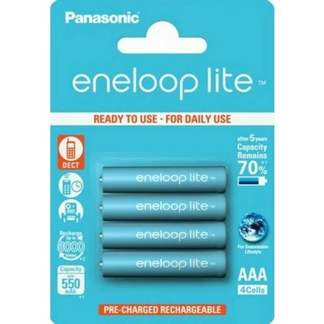 eneloop lite ist ideal für Anwendungen mit geringem bis mittlerem Energiebedarf. Dazu zählen beispielsweise Schnurlostelefone (DECT) oder Fernbedienungen. Sie ist bis zu 3.000 Mal wiederaufladbar.